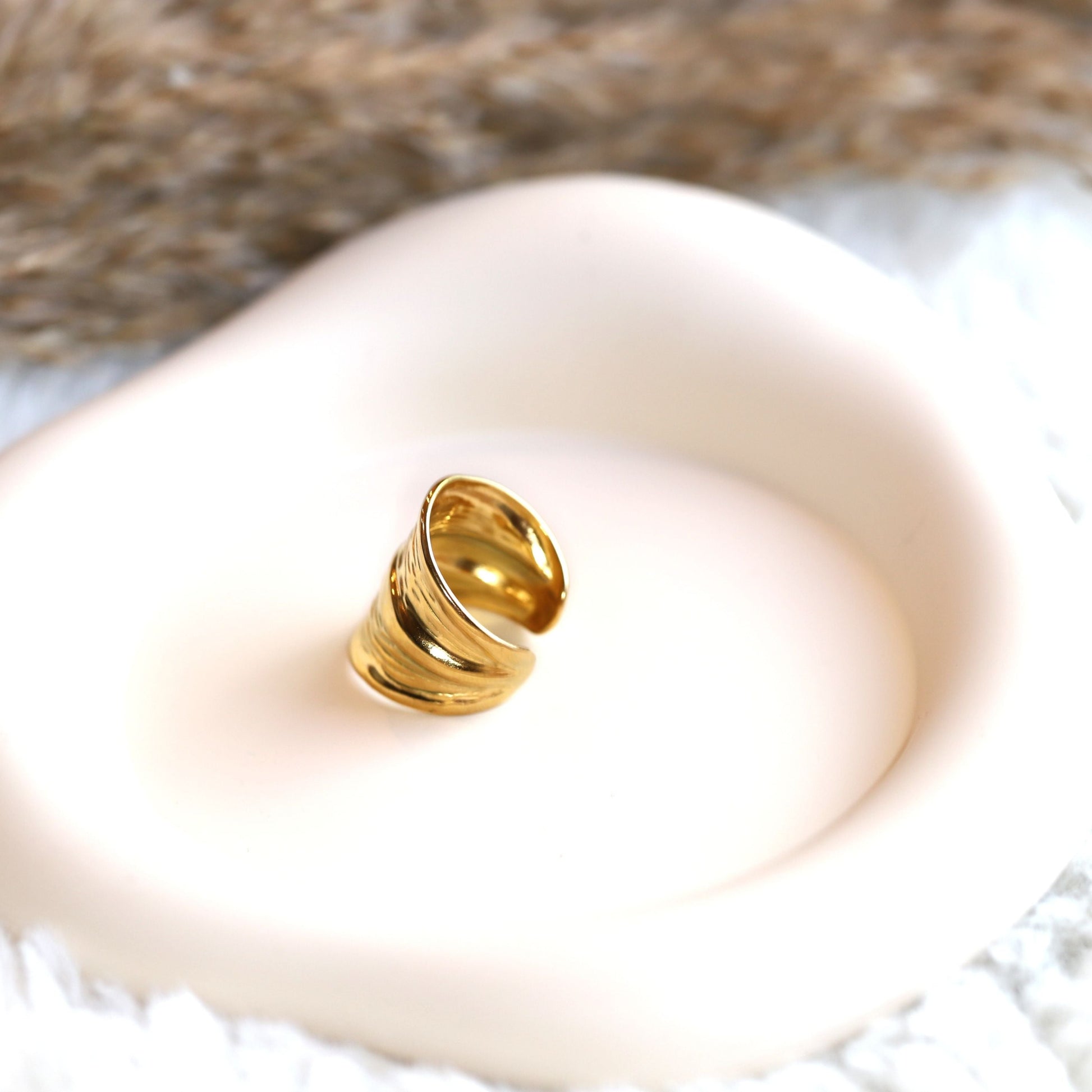 The Seren Textured Band is a bold sculptural ring that captures the raw beauty of molten metal. With its wide silhouette and undulating surface, this high-polish gold piece adds depth, character, and a touch of artistic rebellion to your look. Its organic shape gives it a handmade, one-of-a-kind feel, while the reflective finish keeps it unmistakably modern. Seren is made for the woman who wears her individuality with confidence.