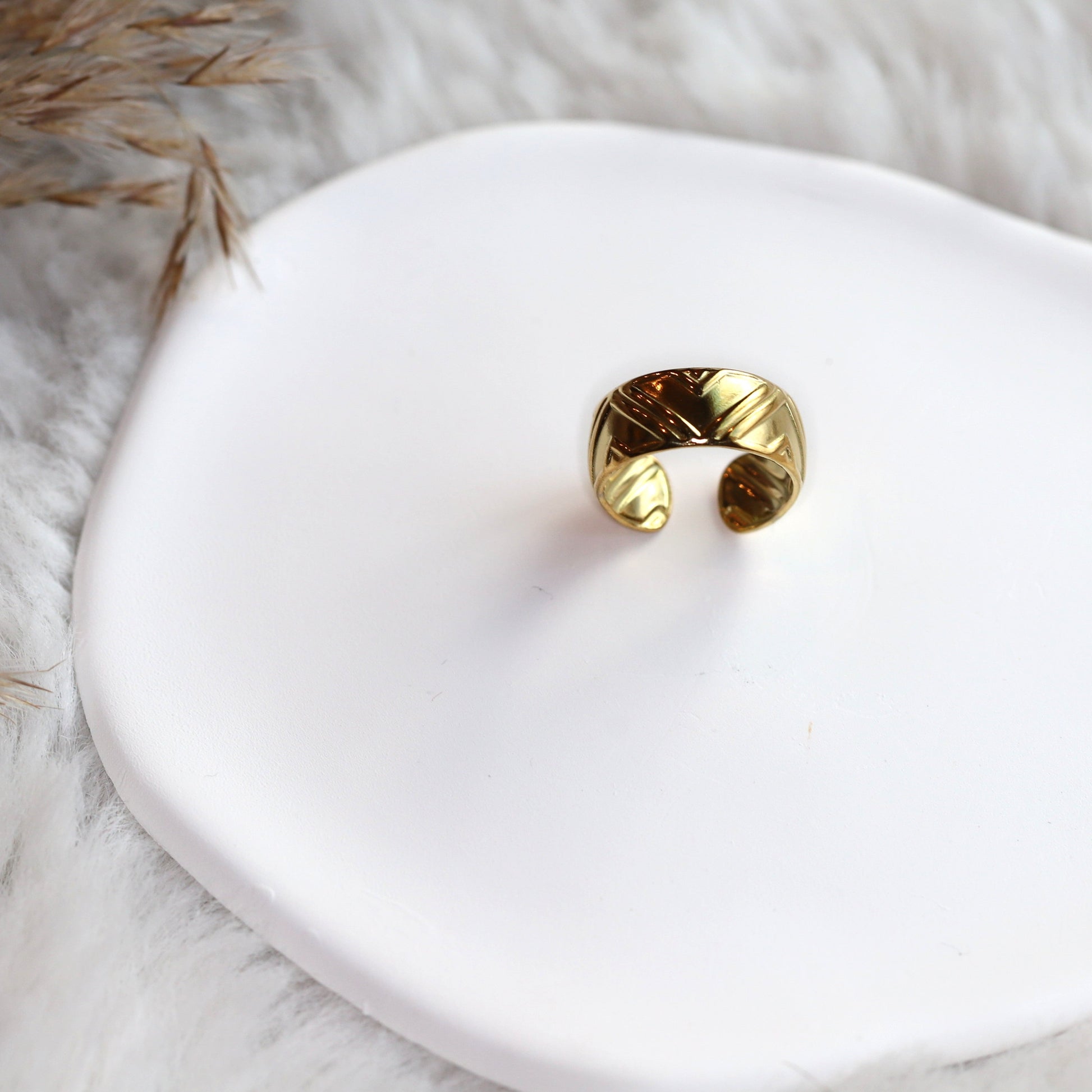 The Solara Ring is a bold yet refined statement piece designed to elevate your everyday style. Crafted from high-polish gold-toned metal, its open cuff silhouette offers an adjustable fit while the geometric etching adds texture and modern artistry. Whether worn alone or stacked with other rings, it brings effortless edge and elegance to your look. Designed for the modern woman who moves with purpose and shines with intention.