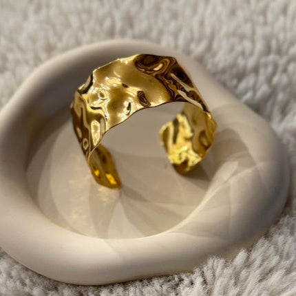 Make a bold, artistic statement with The Liquid Luxe Cuff. a sculptural masterpiece designed to mirror molten gold in motion. Its high-shine finish and fluid, wave-like contours create a striking interplay of light and shadow, making it a standout accessory for any occasion.Hand-polished for a mirror-like gleam, this open cuff design offers effortless elegance with a hint of edge. Wear it solo to command attention or stack it with delicate pieces for a modern layered look.